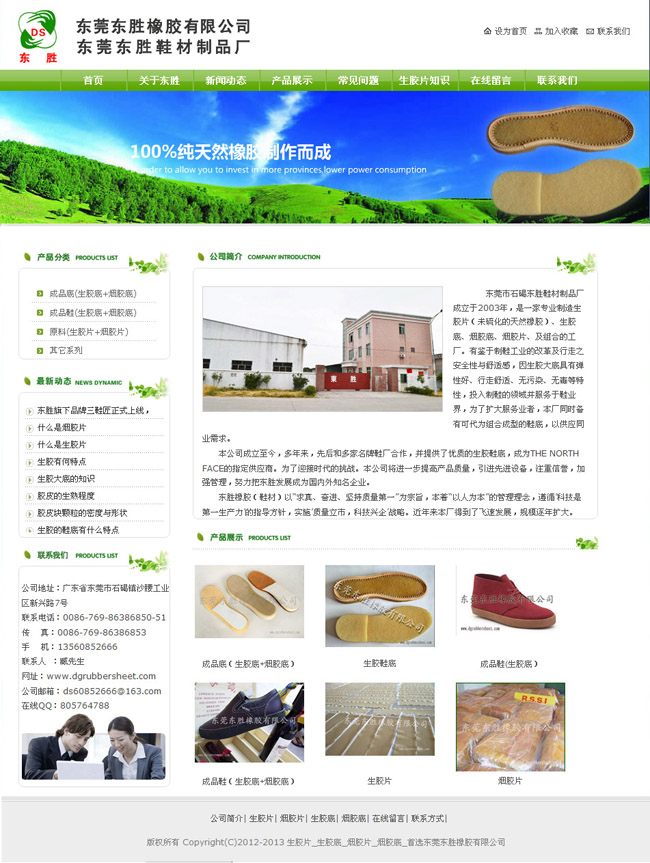 東莞市石碣東勝鞋材制品廠成立于2003年,是一家專業(yè)制造生膠片(未硫化的天然橡膠)、生膠底、煙膠底、煙膠片、及組合的工廠。有鑒于制鞋工業(yè)的改革及行走之安全性與舒適感,因生膠大底具有彈性好、行走舒適、無污染、無毒等特性,投入制鞋的領域并服務于鞋業(yè)界,為了擴大服務業(yè)者,本廠同時備有可代為組合成型的鞋底,以供應同業(yè)需求。