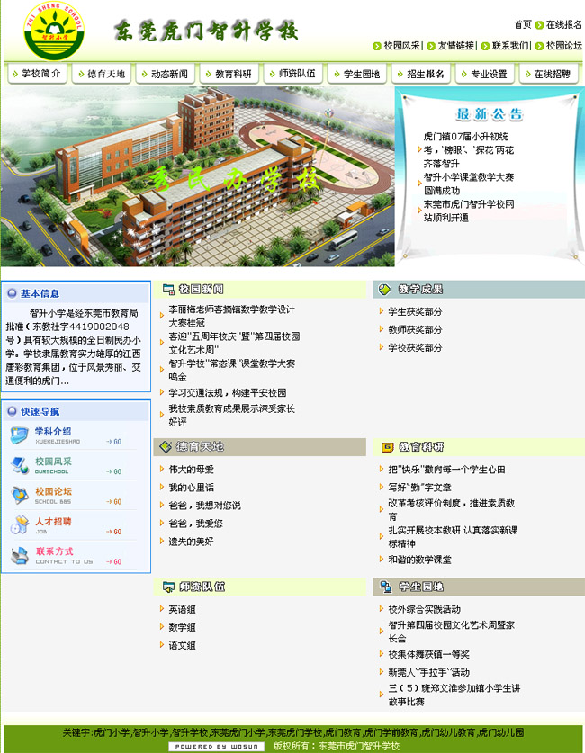 “今天你以智升為驕傲,明天智升以你為自豪。”這是開(kāi)拓進(jìn)取中的智升小學(xué)向莘莘學(xué)子的鄭重承諾!趁著教改的春風(fēng),虎門(mén)智升小學(xué)將與時(shí)俱進(jìn),必定在人杰地靈的虎門(mén)撐起一片璀璨的教育星空!